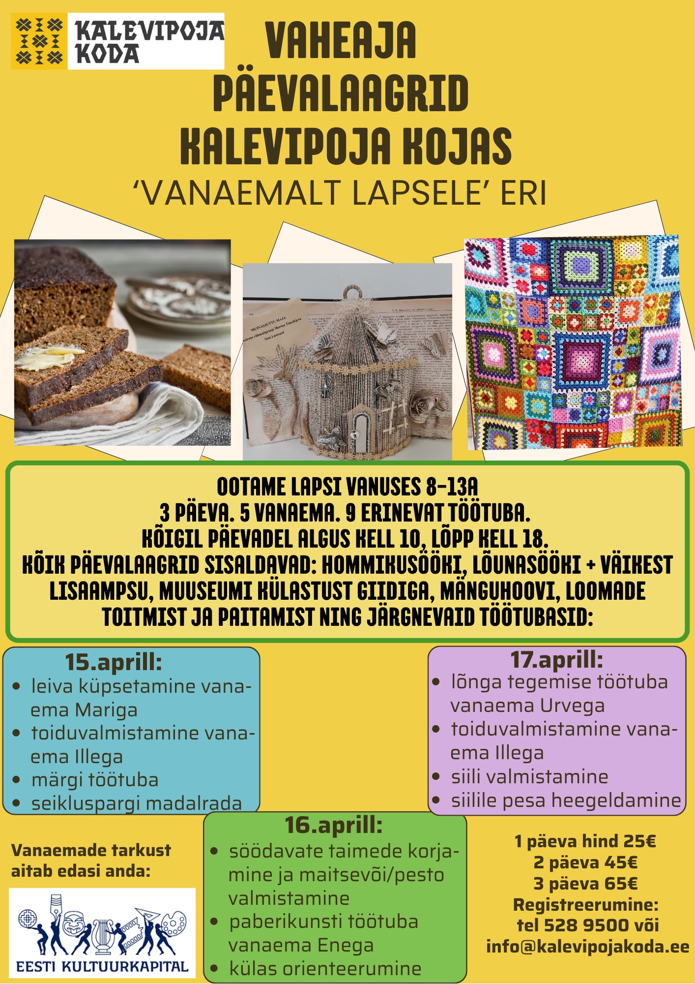 Lapsed on vabad, aga kõigil vanematel ei pruugi see nii olla. Kui soovid, et su laps ei peaks vaheajal kodus igavlema või veel hullem, telefonis istuma, siis meil on sulle lahendus. Too ta üheks, kaheks või lausa kolmeks päevaks meile. Meie töötajad ja sel korral ka meie kogukonna vanaemad hoolitsevad selle eest, et lapsed omandaksid uusi oskusi, saaksid uusi sõpru ja laeksid end värske energiaga.