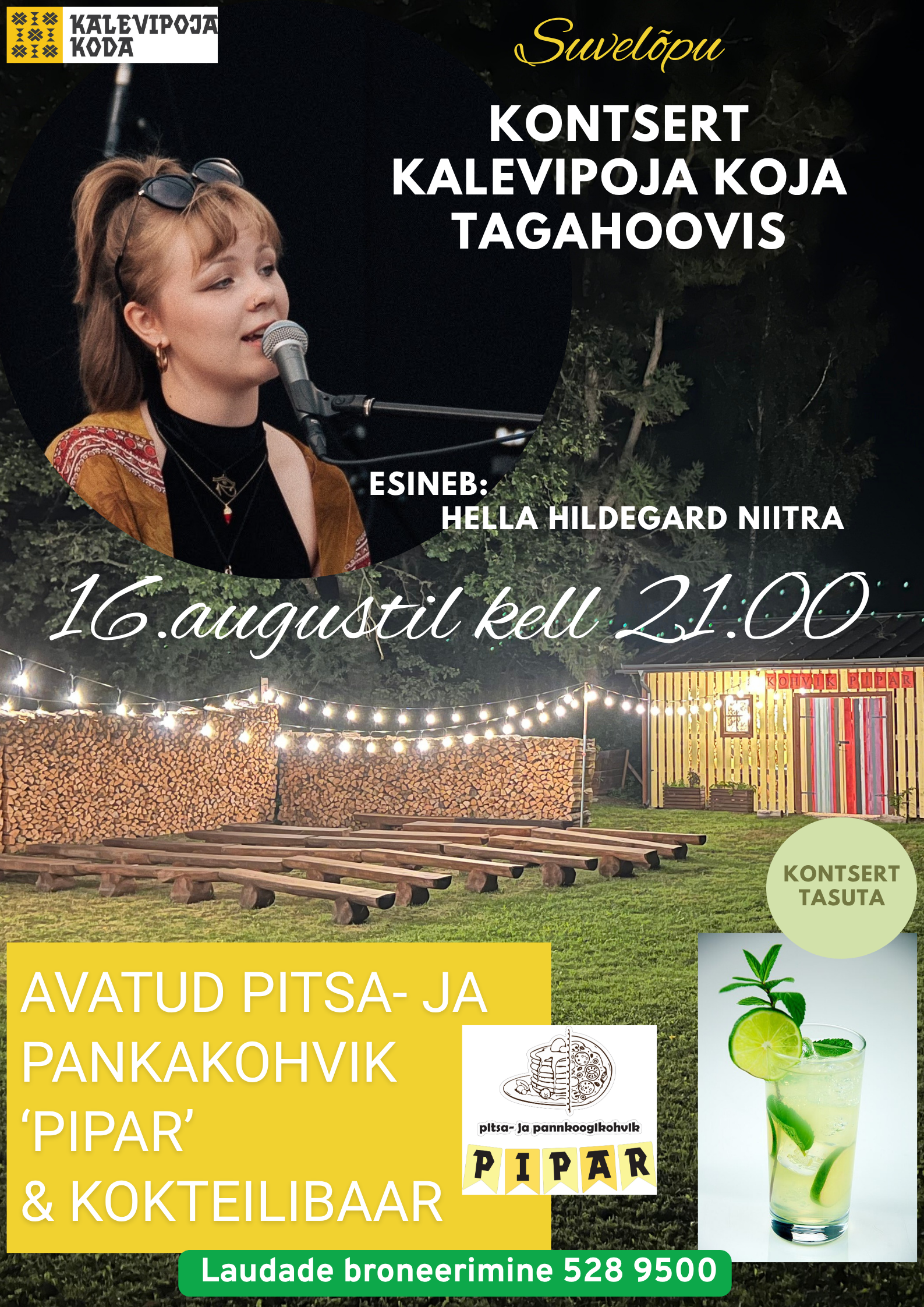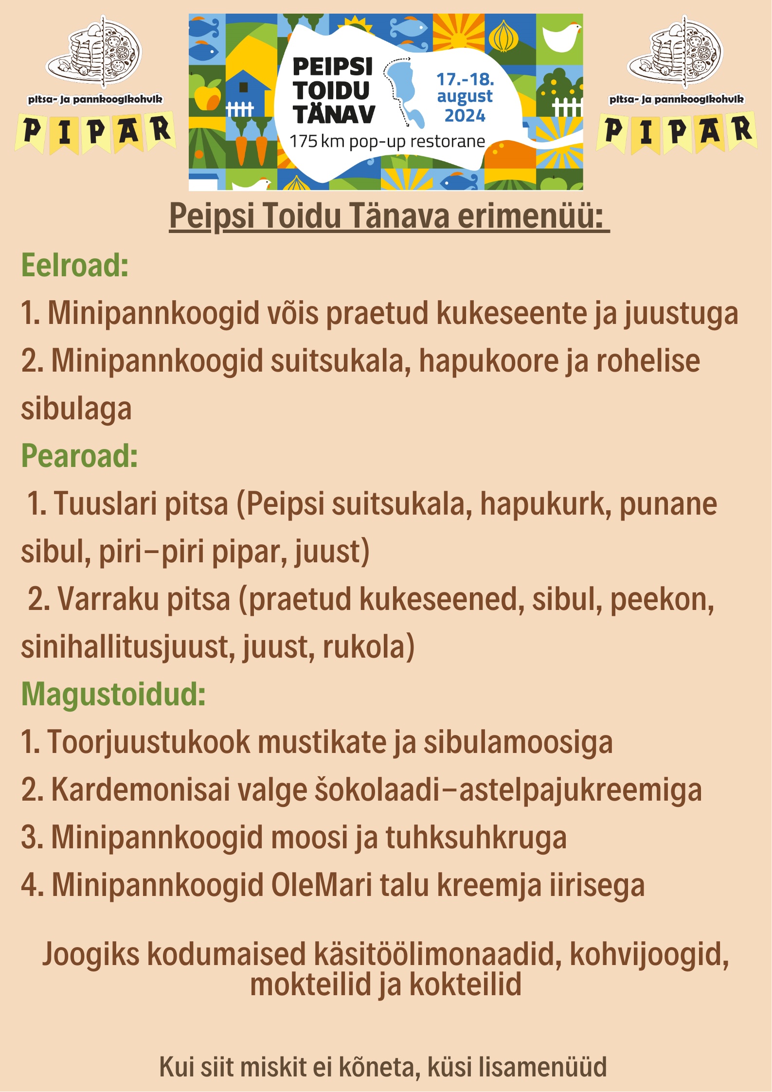 Kalevipoja Koja noortekohvik 'Pipar' osaleb ka sel aastal Peipsi Toidu Tänaval erimenüüga, kus igas roas on kohalikud maitsed sees. On see siis Peipsi järve kala, kohalike metsade seened, meie aedade sibulad või meie metsade marjad. Kohvikud on avatud 16.08 kell 11-21 ja 17.08 kell 11-17. Lisaks on laupäeva õhtul kell 21 Kalevipoja muuseumi tagahoovis kõiki ootamas tasuta kontsert Hella Hildegard Niitralt.