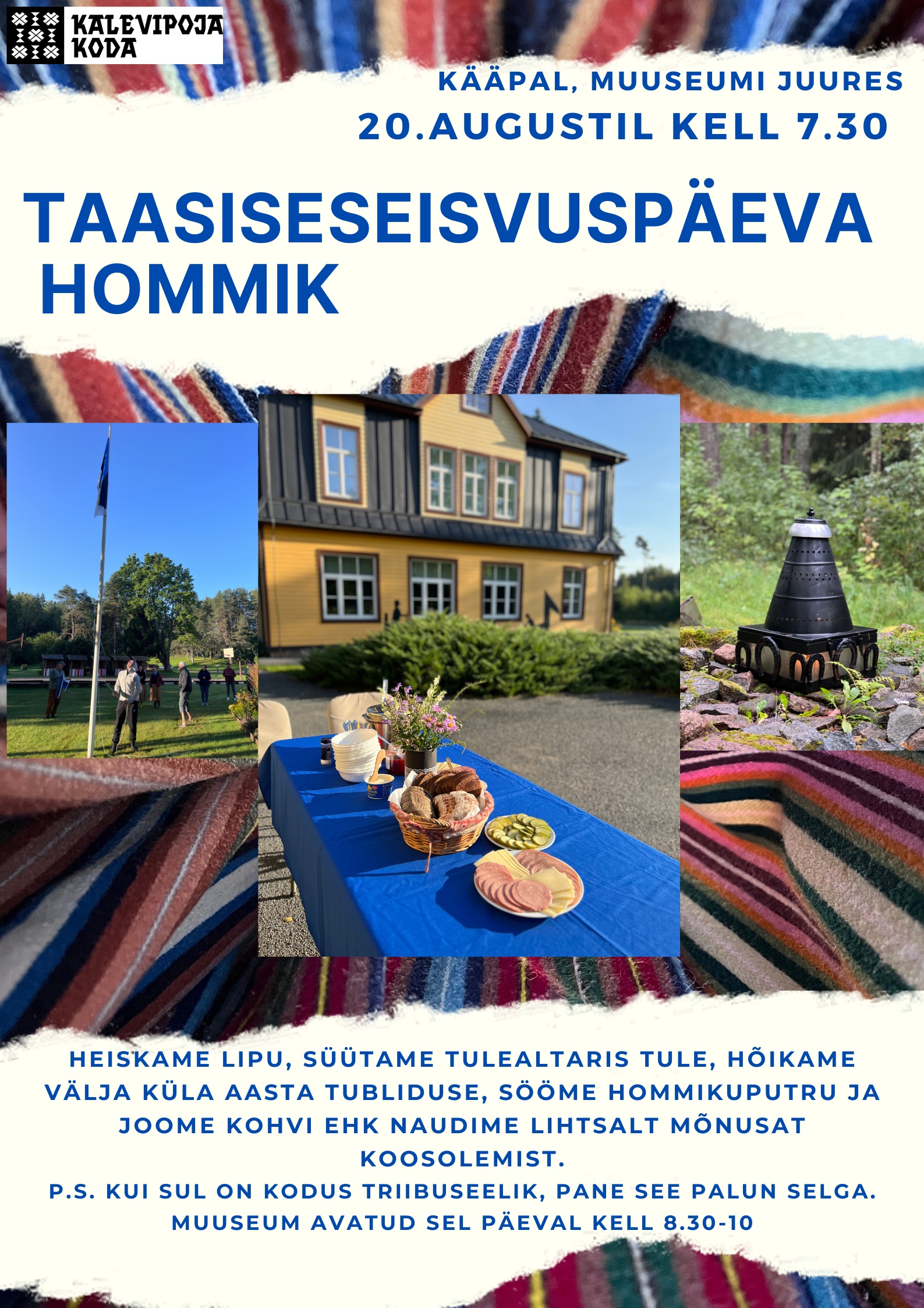 20.augustil ehk taasiseseisvuspäeval alustame hommikut kell 7.30 muuseumi ees. Heiskame koos lipu, süütame tulealtaris tule ja istume koos hommikust sööma. Kõik on oodatud, nii lähedalt kui kaugelt.